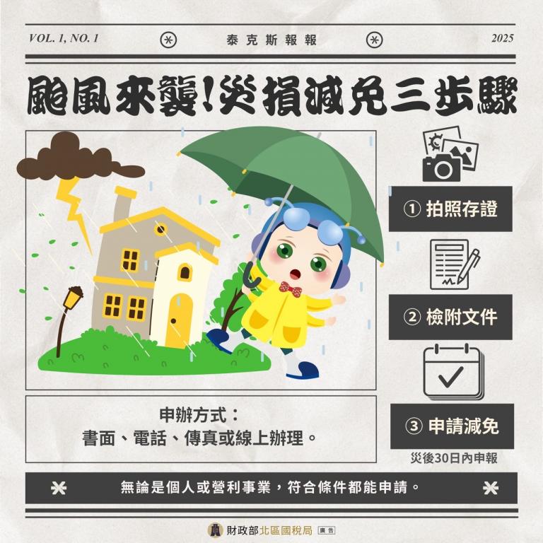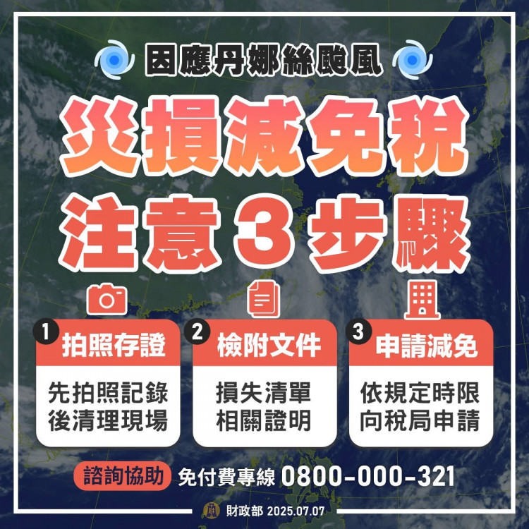 丹娜絲颱風來襲對部分地區災害,財政部北區國稅局竹北分局提醒受災民眾,記得先拍照留下事證,於災害發生後30日內檢具損失清單及證明文件,報請該管稽徵機關派員勘查,以維護自身權益。