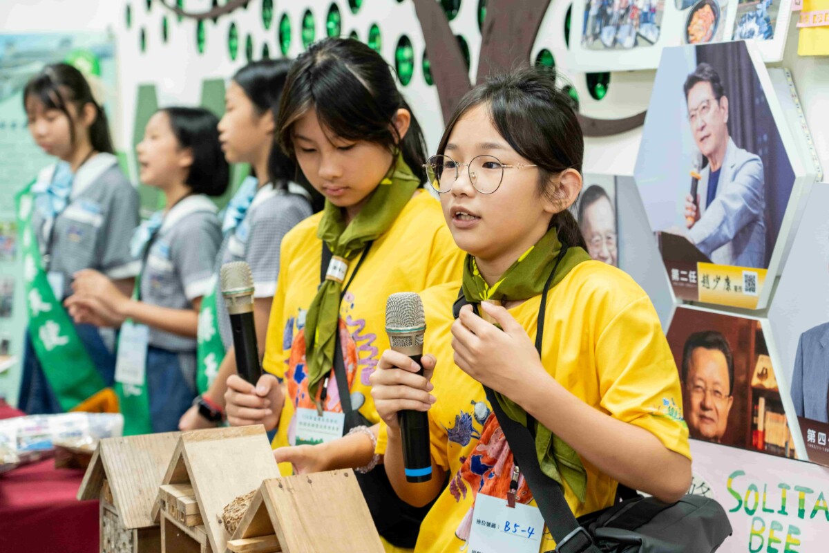 ▲桃園市美華國小同學分享研究新發現的蜜蜂物種特徵。會稽國中不少學生來自單親、隔代教養或新住民家庭,家長平日忙於工作,陪伴孩子從事戶外活動的機會有限。李文義分享,一位參與健走的學生曾對他說「校長,今天這條路是我這輩子走過最遠的路」,孩子的一句話令他深有感觸,「走出家門、踏入自然」對某些孩子來說並非理所當然,可能是前所未有的人生體驗與成長突破。