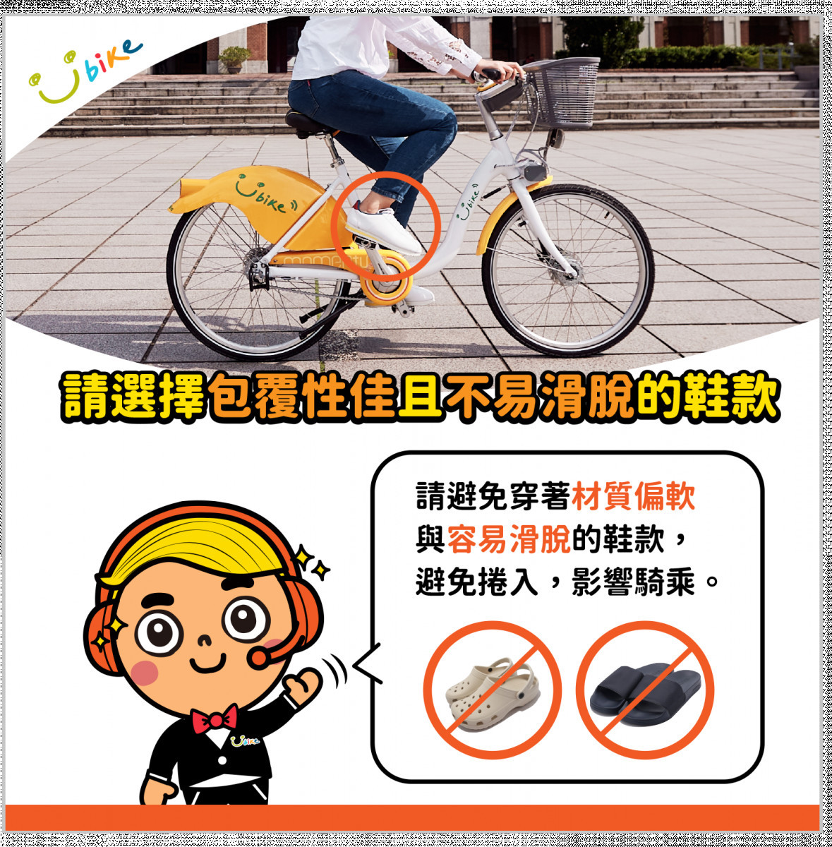 此外,也提醒拖鞋與洞洞鞋容易滑脫,影響自行車踩踏、剎車等動作,且因少了保護、容易受傷,所以騎乘自行車請選擇包覆性佳且不易滑脫的鞋款,以確保自身騎乘安全。