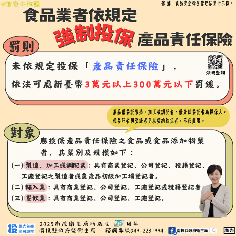 【記者 謝雅情/南投 報導】去年寶林茶室案就因保險失效,讓受害者求償無門,使食品業者投保產品責任險議題成為大眾關注的焦點。南投縣政府衛生局提醒食品業者,應依據「食品安全衛生管理法」第13條投保產品責任保險,未投保者依食安法第47條規定,可處新臺幣3萬元至300萬元罰鍰,情節重大者,並得命其歇業、停業一定期間。