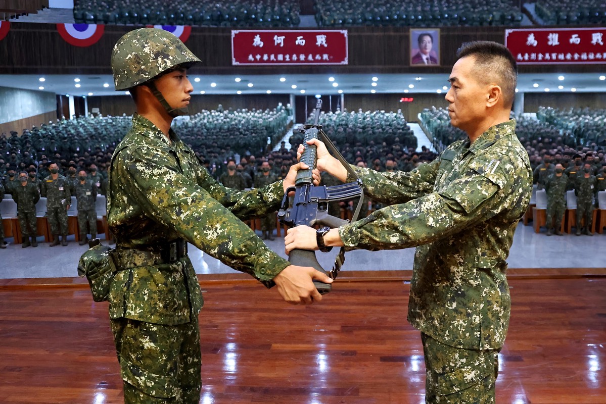 ▲陸軍上將司令呂坤修在三軍九校院聯合入伍訓練開訓典禮中為入伍生授槍。(圖/記者莊全成攝)