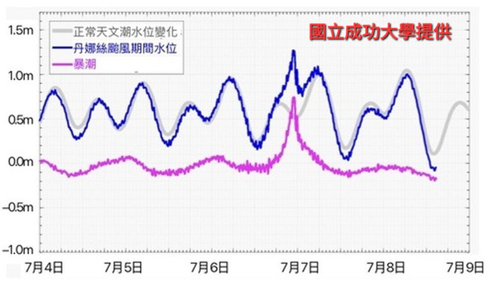 【勁報記者于郁金/臺南報導】受到丹娜絲颱風襲擊,臺南市七股區出現嚴重災情,尤其是西寮里受創最為嚴重;當地不僅遭受強烈風害,還遭遇極端暴潮侵襲,導致大規模海水倒灌,村落嚴重淹水,災情雪上加霜;根據國立成功大學近海水文中心的協助水利署進行觀測與分析顯示,颱風侵襲當晚,臺南沿海地區出現近1公尺暴潮水位,屬於200年重現期等級極端事件,打破當地有紀錄以來觀測紀錄。