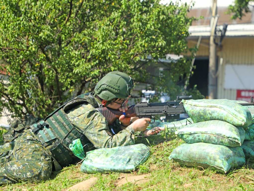 演練開始前,陸軍步兵206旅步4營步2連部分兵力於陣地內警戒,於接獲敵小部隊襲擾狀況後,各班即進入戰鬥位置,對敵軍實施射擊;過程中模擬官兵中彈狀況,透過各伍交互掩護,前往接替射擊陣地,並同步對傷患實施止血等戰傷救護,驗證應變處置作為,確保守備區域安全。