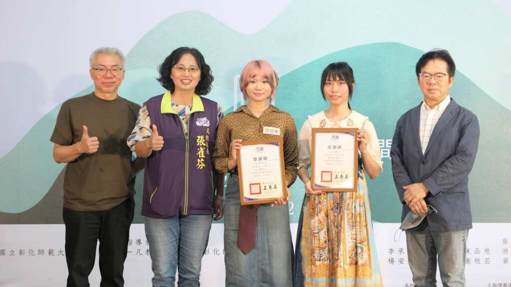 ▲彰化縣文化局張雀芬局長與邱文正系主任、陳一凡教授、策展人合影1。(彰化縣文化局提供)本次展覽共展出七件裝置藝術作品,由師大美術系師生精心創作: