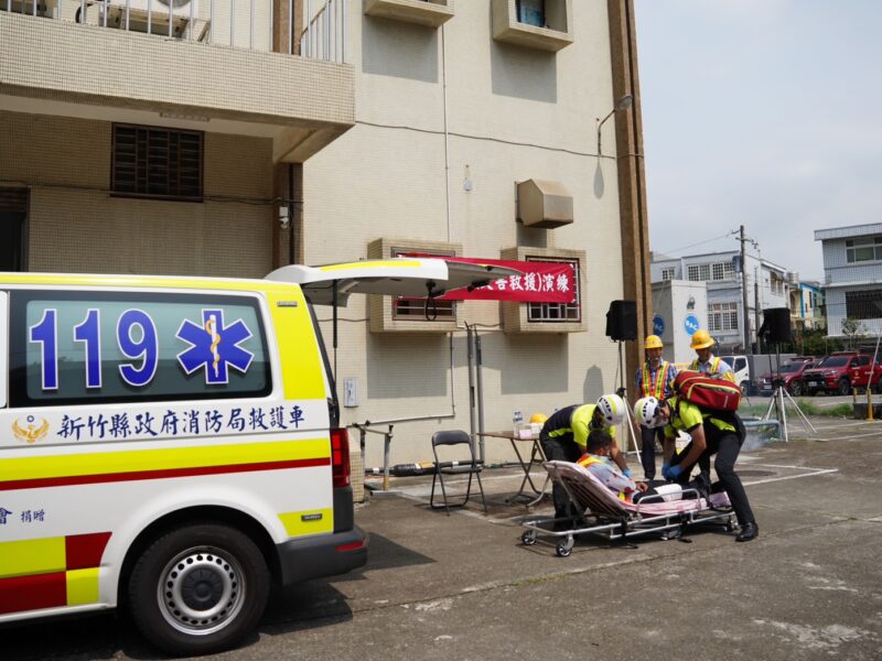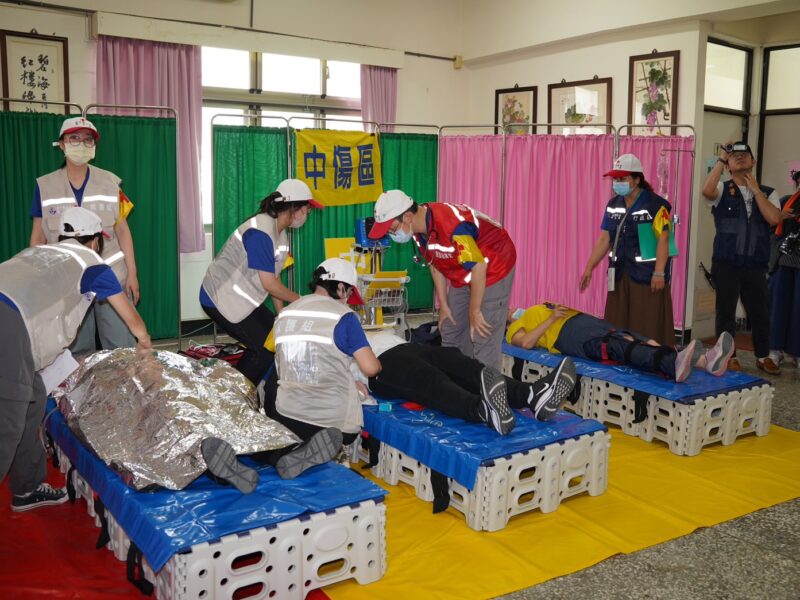 最後則前往新豐鄉老人會館(文康活動中心)視察急救站暨救濟站開設情形,實施急救站傷患現場醫療處理及救濟站災民轉移收容等實作演練,了解為災民檢傷、登錄、暫時安置、供餐、心理支持等分工。