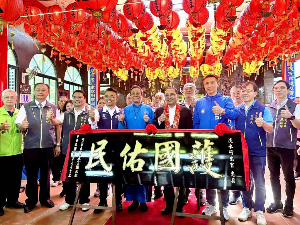 圖說:侯友宜接續來到淡水行忠宮參拜,並致贈「護國佑民」匾額予以廟方,由主委黃德利(左5)代表受贈。