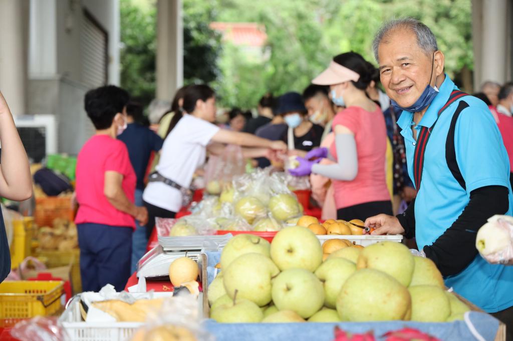 ▲「2025新埔水梨節暨農產品行銷活動」盛大開幕,新竹縣副縣長陳見賢關心農民們銷售情況,也現場試吃、採購水梨表達支持。(圖/竹縣府提供)