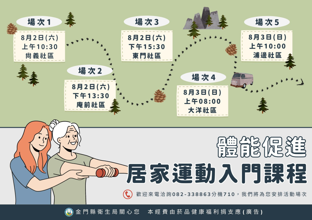 【勁報記者于郁金/金門報導】金門縣衛生局為提供民眾更簡便、低門檻運動方式,將於8月2、3日於社區辦理「體能促進:居家運動入門課程」,特邀具專業證照之高齡運動講師指導長者、體力衰弱者及病後復原者進行暖身、肌力、平衡與伸展等運動;課程強調簡單、安全且可持續居家運動設計,協助民眾建立良好運動習慣,營造健康生活型態。