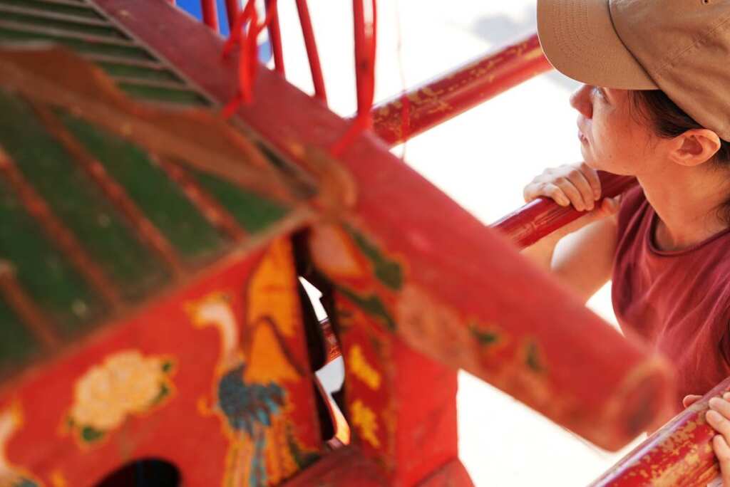 今年6月,她特別參與北竿橋仔境「上惠林女帥宮」的聖誕儀式,這座主祀女帥將軍的廟宇,其廟務與陣頭成員全由女性組成,獨具特色。活動從上午8點開始,歷時超過14小時,三次扛轎問事儀式接連進行。她在儀式中不僅見證整個過程,還獲主委邀請親自加入扛轎行列,並首次被允許將GoPro攝影機安裝於神轎內,從神明視角記錄下整場過程,成為此次創作的珍貴素材。