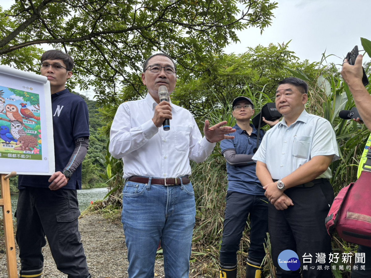 新北市長侯友宜今(22)日前往視察汐止區的白匏湖,一早在工務局同仁帶領下,一路從綠意盎然的羊腸小徑抵達白匏湖,看到工務局以維護生態的概念開闢白匏湖感到非常欣慰。並指白匏湖與周邊自然復育的過程,是新北市環境教育重要的教科書。