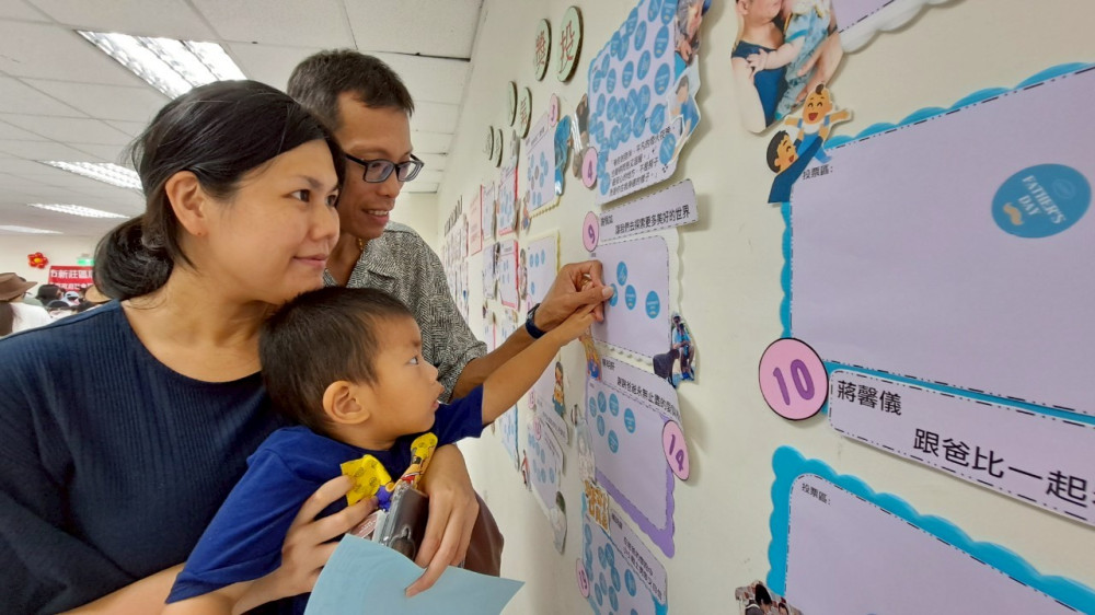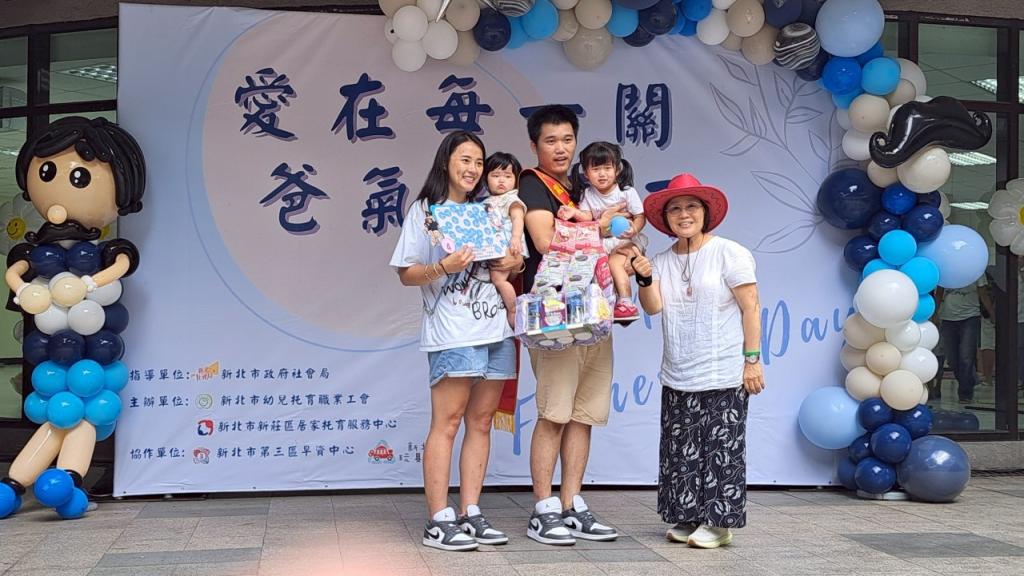 (大成報記者張玉玲/新北報導)新莊區居家托育服務中心為加強保親關係,結合早療資源中心和玩具銀行,於父親節前夕,在新泰市民活動中心舉辦「愛在每一關、爸氣闖天下」保母協力圈活動,有近200位保母和家長及小朋友參加,親子間或DIY手作,或動手修玩具,還有超人氣爸爸票選等,結束時小朋友還可以將蘋果造型氣球帶回家,場面非常的溫馨可愛。