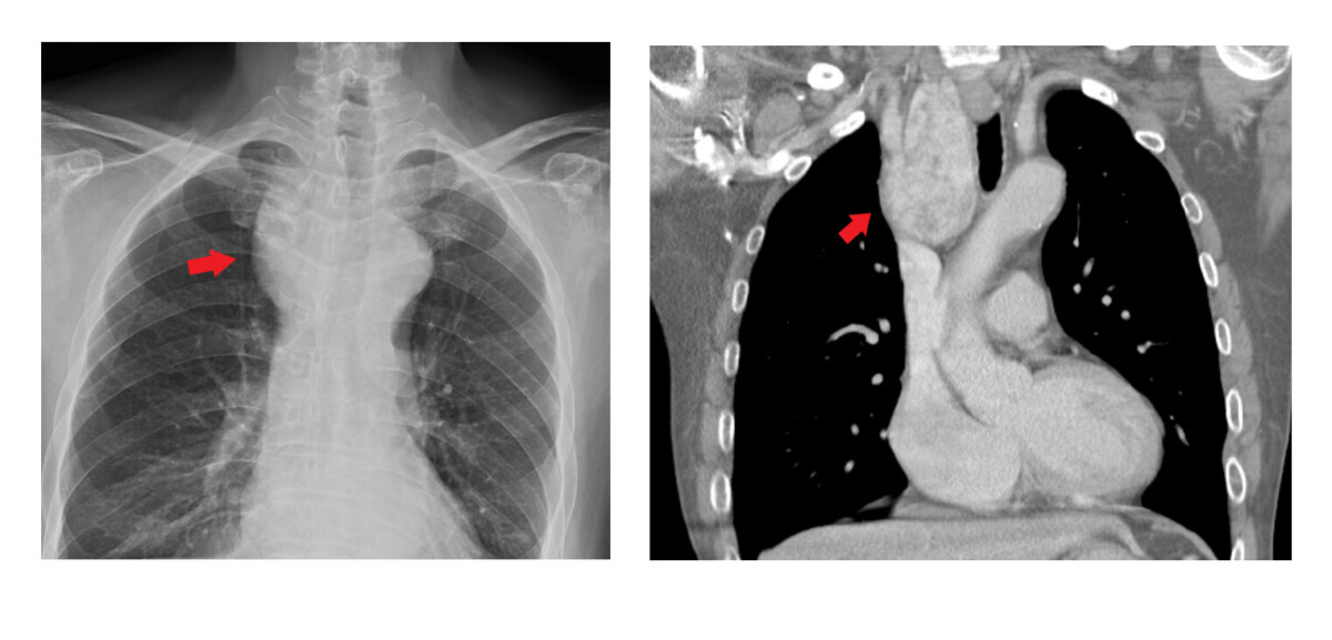▲左圖為胸部X光,右圖為電腦斷層顯示甲狀腺結節是甲狀腺內部形成的異常組織腫塊,台灣成人盛行率高達40%以上,幸好超過九成以上都是良性的。林晏甥指出,大多數結節位於頸部,但少部分會向下延伸至胸骨後方甚至胸腔內,當結節體積有超過50%位於胸腔,即稱為「胸骨後甲狀腺結節腫大」或「縱膈腔甲狀腺結節」,約占所有甲狀腺手術的3%至17%。