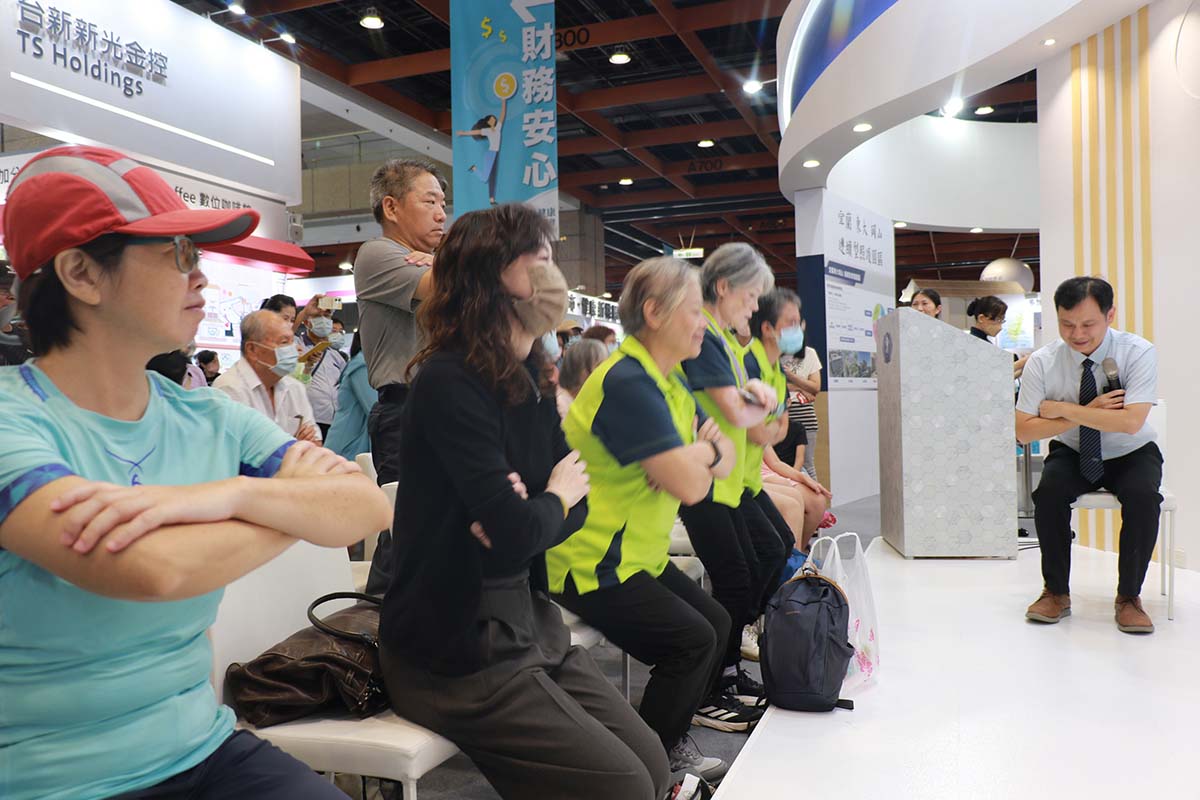 ►張舜欽主任現場示範用椅子做腿部肌力訓練,觀眾紛紛跟著學習,希望平時也能在家鍛練。