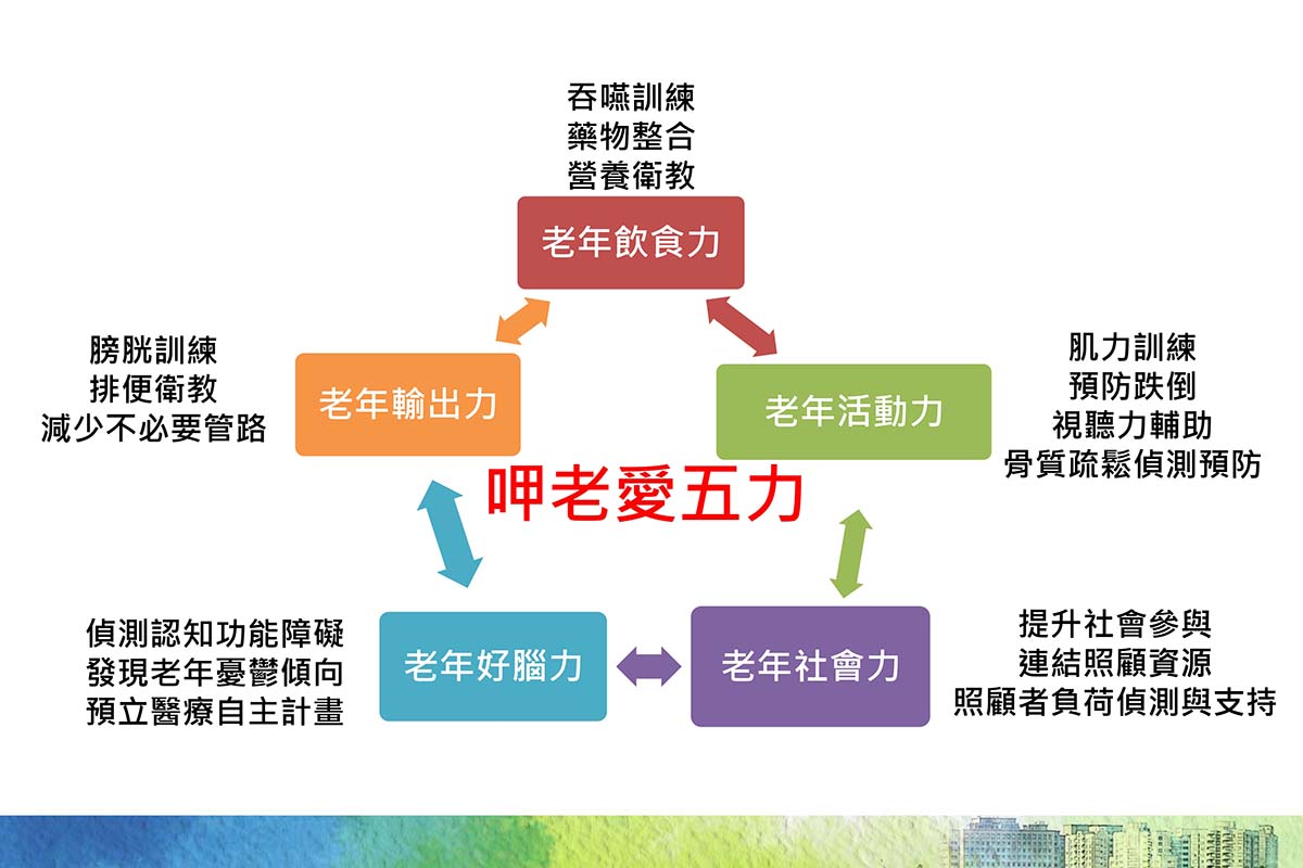 ►大林慈濟醫療團隊推動「呷老愛五力」整合照護,涵蓋活動力、飲食力、輸出力、社會力與好腦力。