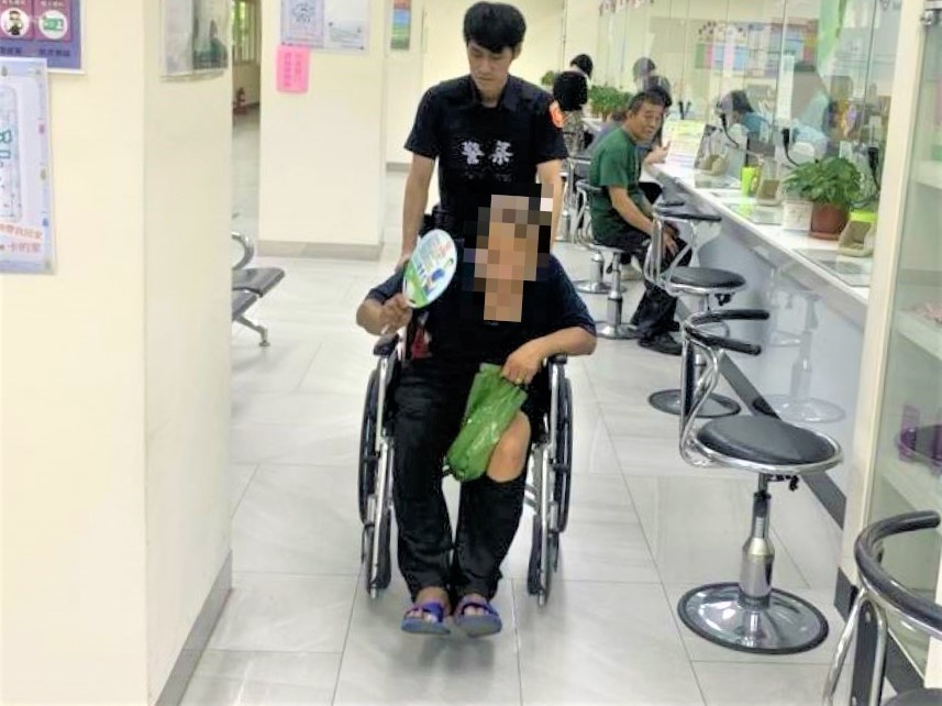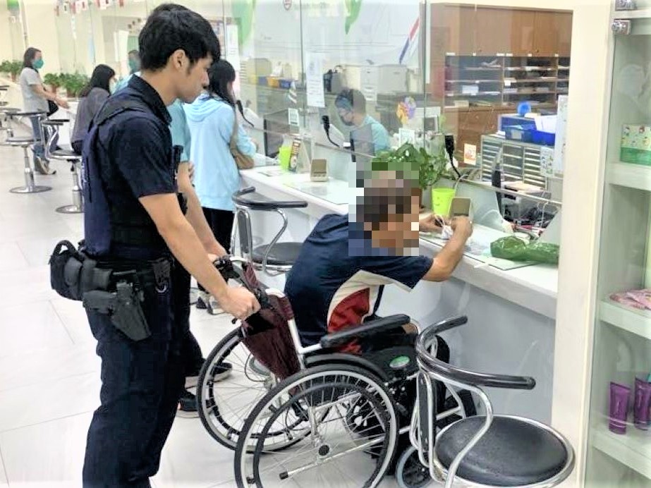警方在巡簽金融機構時,發現1名老翁坐著輪椅於郵局門口,老翁不停使用右腳緩慢移動著,警方見狀立即主動上前關心詢問;老翁滿頭大汗向警方表示要進去裡面存錢,警方見狀暖心告訴老翁可以將他的右腳收起放回輪椅的踏板上,警方推著輪椅將老翁從門口推至抽領號碼區,等待叫號碼過程時,警方詢問老翁發生事情的經過。