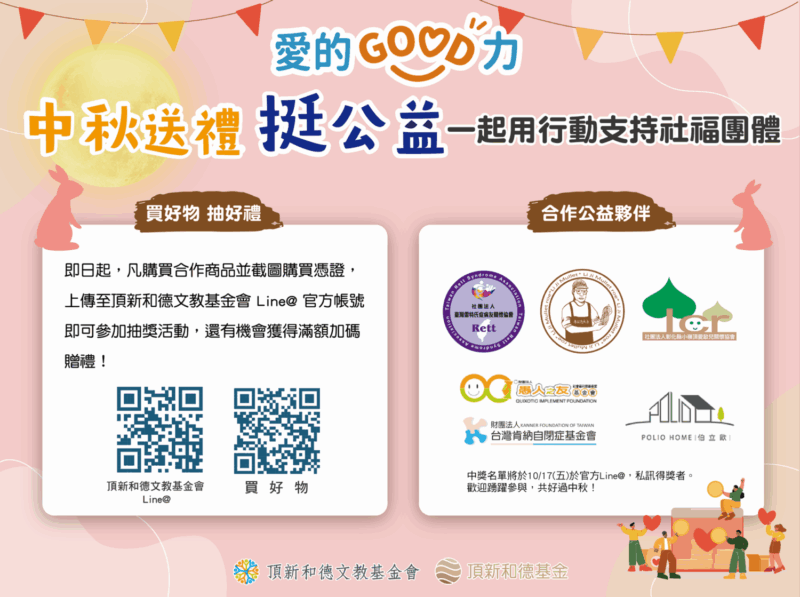 頂新和德文教基金會創辦人魏應充希望基金會秉持「台灣共好」精神,協助中小型社福團體穩定自立經營,邀請大眾一起守護弱勢,讓愛延續!即日起至9/30前,在「愛的GOOD力」平台購買指定中秋節禮盒,加入頂新和德文教基金會官方Line好友即可參加抽獎;單筆消費滿2000元再加碼贈送限量精美禮盒,優惠活動詳情請洽官網:https://gogo-good.com/