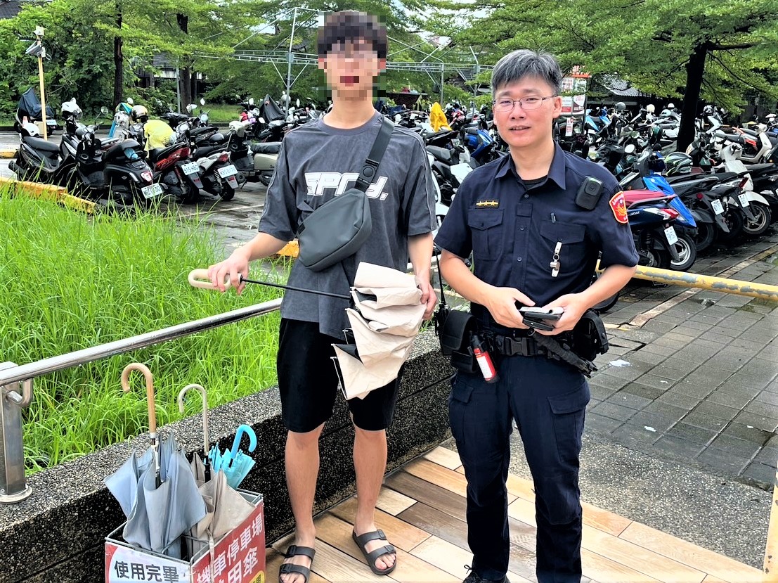 經前往機車停車場處所放置的借用傘架,果真發現周男的雨傘在該傘架內,周男恍然大悟係自己的疏忽,直呼很不好意思,頻頻向員警道謝,感謝警方的執勤經驗,讓他能順利找尋到心愛的雨傘,以後不會再將雨傘亂放置在借用傘架區,避免造成誤會。