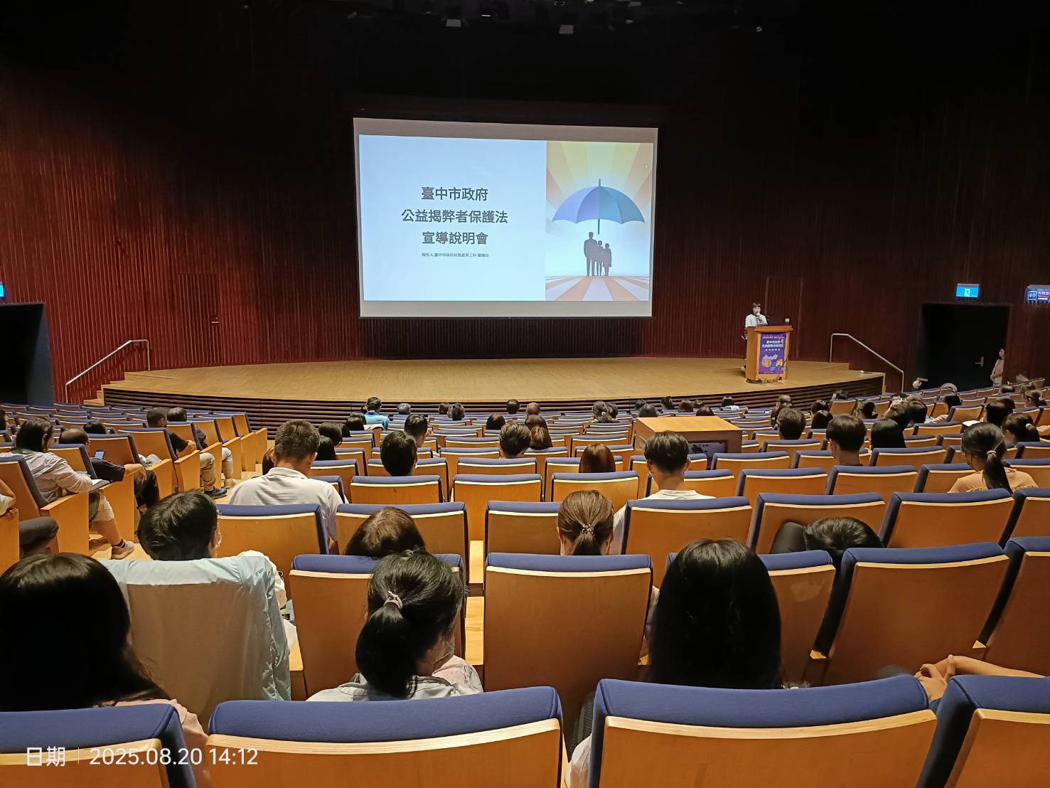 報新聞/中部特派員鄒志中報導 「吹哨不孤單,法律挺您到底!」為保障吹哨者權益,深化廉政根基,共同實現保護揭弊、正義永續的廉政願景,落實2025年7月22日正式施行的《公益揭弊者保護法》,台中市政府2025年8月20日隆重舉辦一場重要的宣導說明會。本次活動旨在強化公務體系對新法的充分認識與理解,進而擴大保障揭發公部門不法行為的公益揭弊者,鼓勵其勇於發聲,並確保公務員依法行政,共同實踐廉潔治理,落實「陽光政治,效能政府」的核心理念。