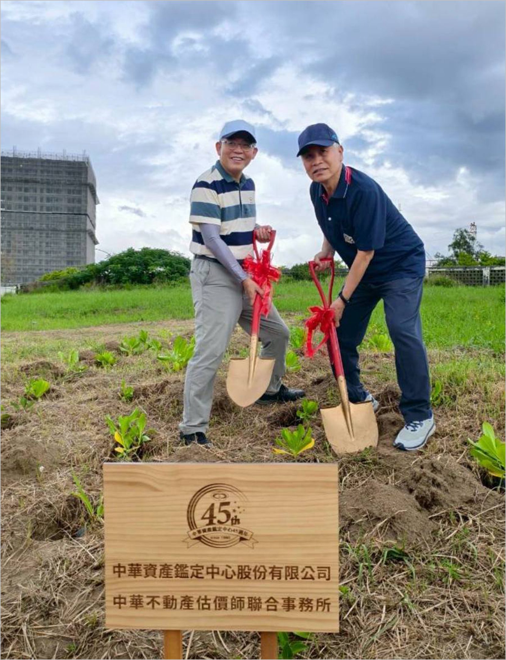 圖:中華資產鑑定中心董事長楊三峰(右)與國家住都中心董事長花敬群於45週年系列植樹活動中,共同揮鋤植樹,象徵攜手推動ESG與永續發展。圖/中華資產鑑定中心提供