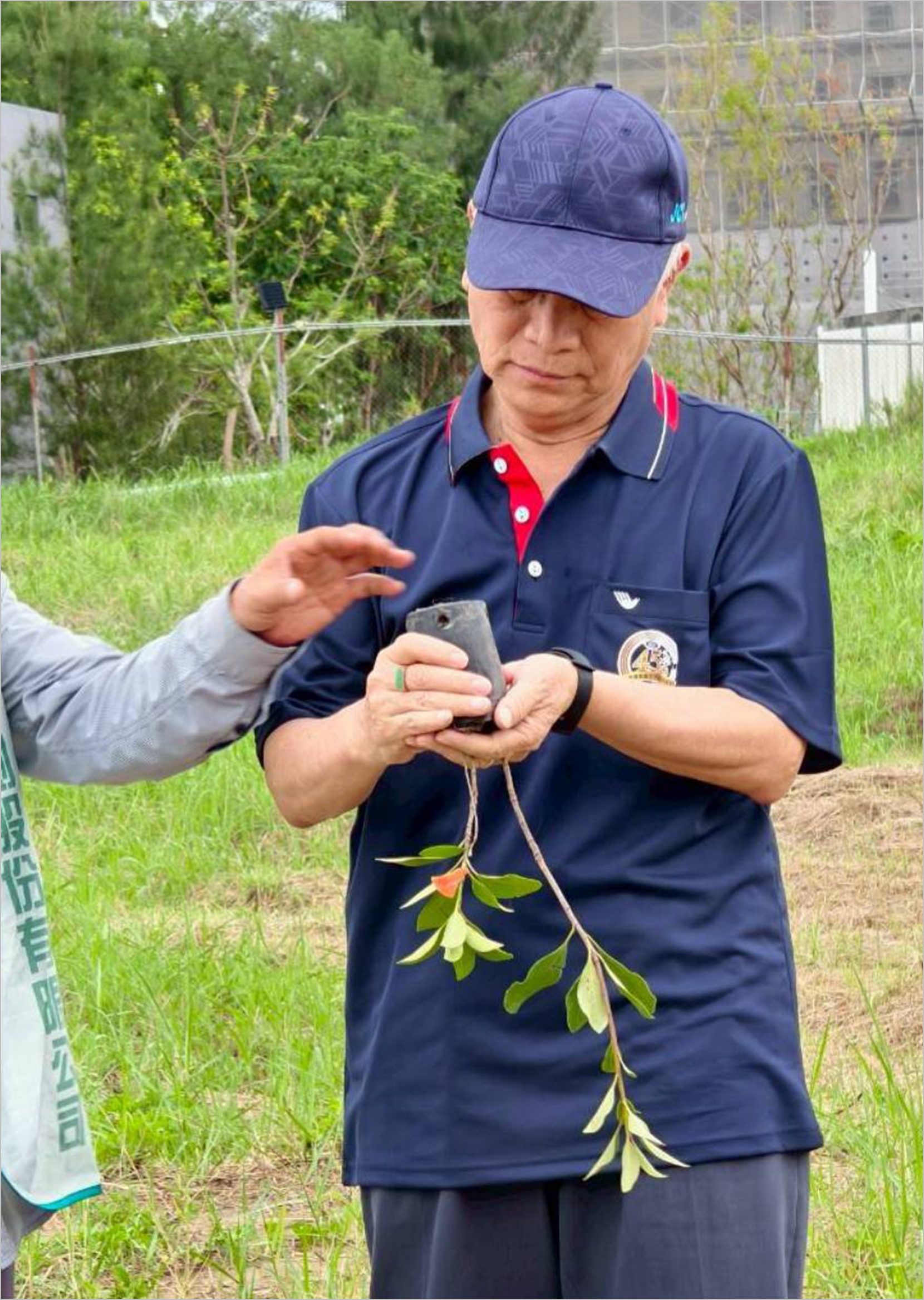 圖:楊三峰董事長在45週年植樹活動中,親自關注樹苗細節,顯現從根本培育綠色未來。圖/中華資產鑑定中心提供