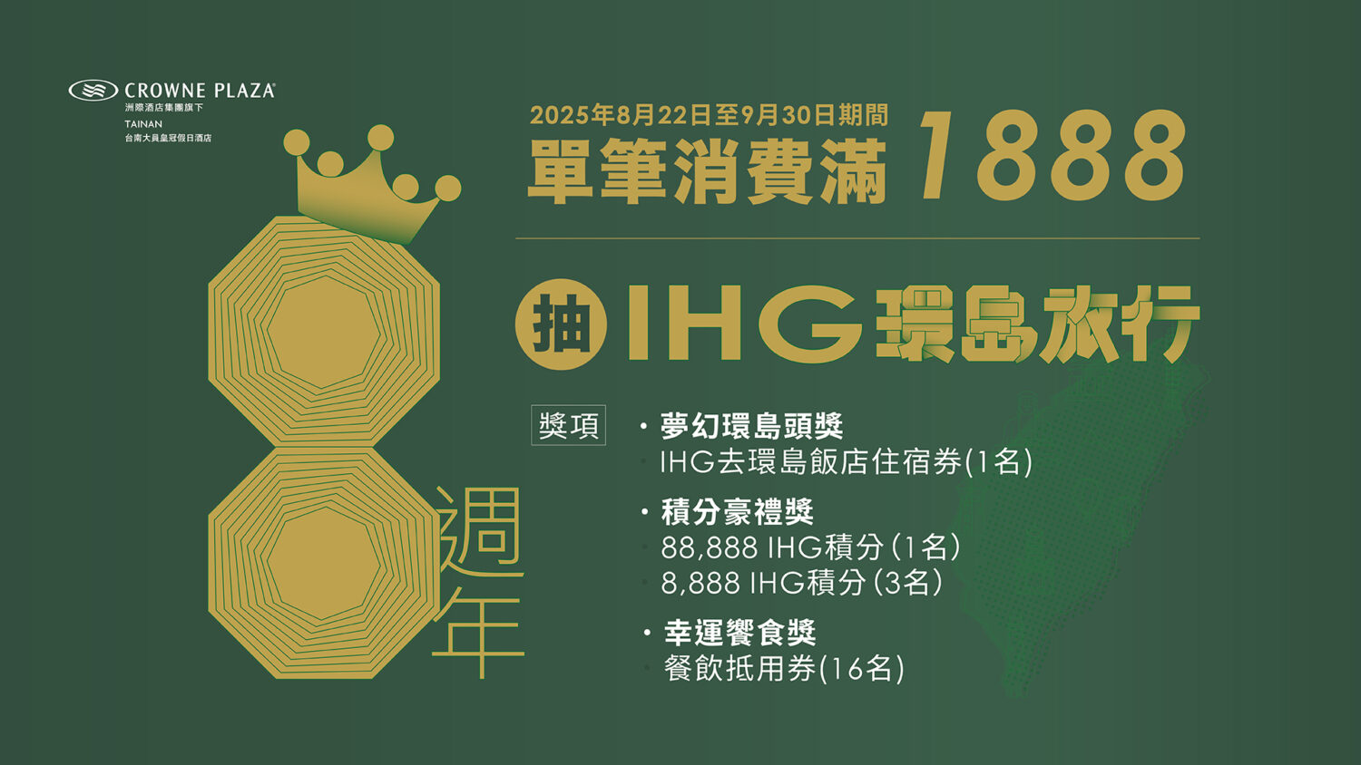 八週年慶期間,全館單筆消費滿1,888元即可獲贈摸彩券參加抽獎,有機會抽中「夢幻環島頭獎——IHG去環島住宿券」。消費越多,中獎機率越高!幸運得主將一次擁有IHG旗下六間精選飯店的住宿體驗,包括:台北金普頓大安酒店、台北晶華酒店、台中勤美洲際酒店、阿里山英迪格酒店、嘉義福容voco酒店,以及高雄洲際酒店,實現暢遊全台的五星級度假夢想!