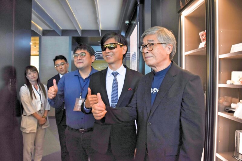 ▲體驗MIT與故宮聯名產品「TITAN青花龍紋飛行員眼鏡」。圖由左至右:艾德國際黃志昌總經理、產發署邱求慧署長、故宮博物院黃永泰副院長。(圖/中衛發展中心提供)