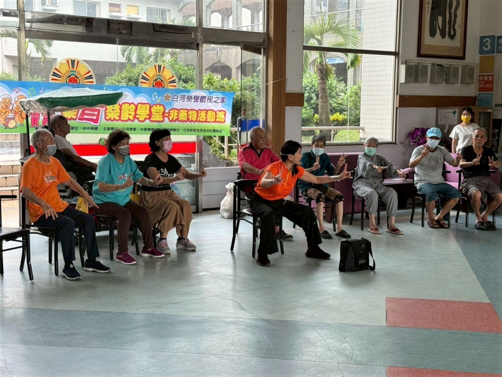 白河榮家家主任姚辰蕙表示:今年新成立樂智樂齡學堂課程,參加住民長輩,相當踴躍、堂堂爆滿;住民長輩可透過系列肢體律動與輕鬆敲擊,伸展筋骨、延緩失能與失智;照護同仁們參與其中,與住民學員一起互動,家庭化照護理念就在樂智樂齡學堂;「非藥物治療」活動班,不僅提升長輩生活品質與人際互動,同時也療癒照顧者,減輕照護壓力。