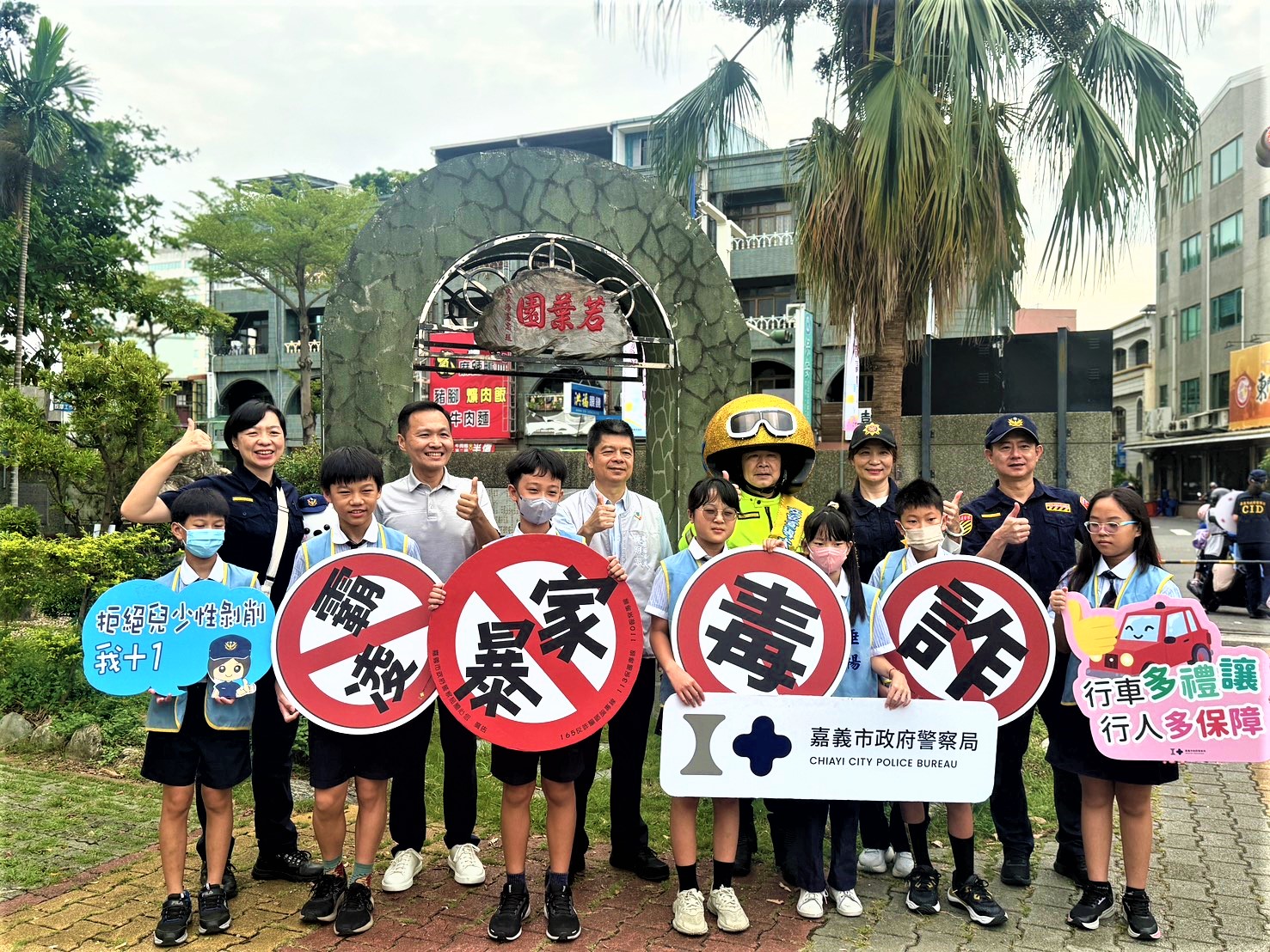 為吸引大小朋友關注交通安全,「交通安全大使」特別騎乘哈雷重機車及戴上超大型安全帽,讓學童在互動中了解,騎、搭乘機車要戴妥安全帽的重要性,也讓「交通安全、快樂上學、平安回家」理念更具象傳遞;警察局也配合開學活動加強校園周邊交通秩序維護,並持續推動防制少年犯罪及校園安全維護工作,利用入班入校等時機,加強對師生實施交通安全、防詐毒及防制校園霸凌等宣導,共同攜手守護友善校園,提升嘉義市整體校園安全防護力,此外還特別結合時下流行文化結合交通安全與犯罪預防宣導,製作開學限定「嘉華三朵花」小卡,寓教於樂讓孩子們能在日常活動中學習正確的交通知識,不僅懂得守護自己,也能把所學帶回家,提醒阿公、阿嬤等長輩遵循規則,期藉「小手拉大手 大手牽小手」讓交通安全宣導的力量深植家庭,進而向社區擴散。