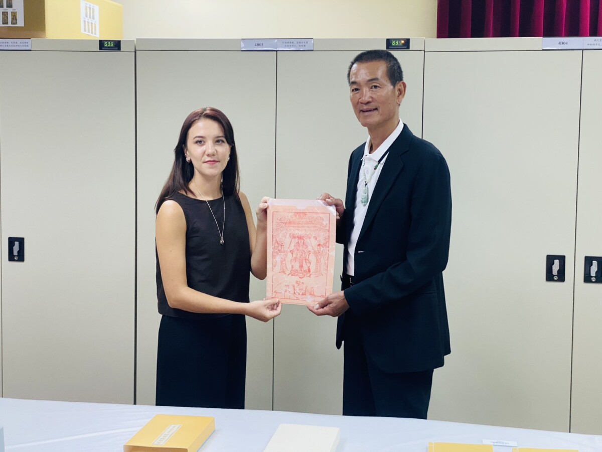 ▲北港朝天宮蔡咏鍀董事長特別贈送 Anaïs 一份北港鎮宮三寶之一《天后昭應錄》的複本,象徵媽祖的庇佑。(記者蘇峯毅攝)Anaïs Diez 現職於巴黎裝飾藝術博物館,專攻紙質類藝術品修復。她於2022年自法國國家文化遺產學院取得碩士學位,具備嚴格國家認證修復資格。此行來臺,除延續學術交流精神,也為深入理解東方信仰藝術提供難得契機。