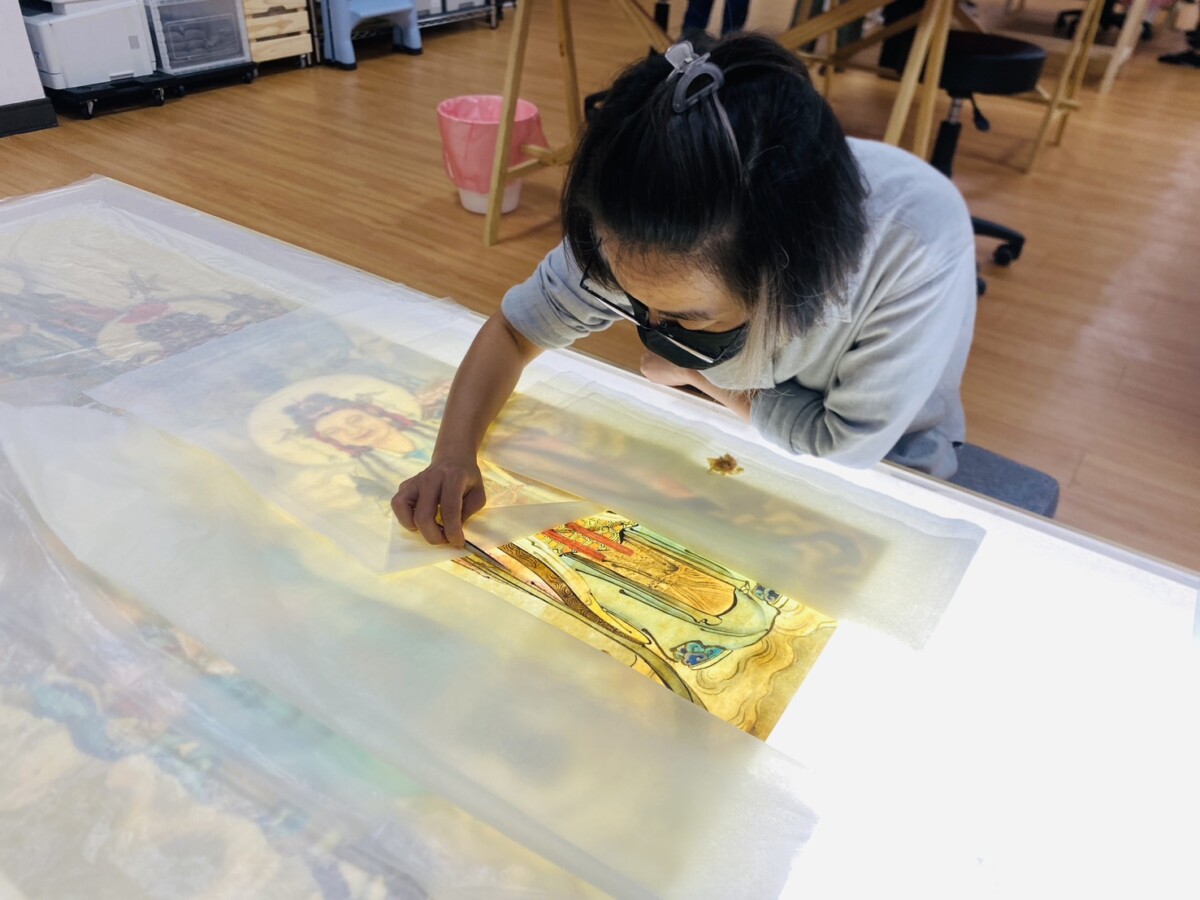 ▲王思涵修復師現場進行已故國寶大師陳玉峰21幅法會掛軸的修復。(記者蘇峯毅攝)在修復師侯宗延與林煥盛教授的指導下,Anaïs 進一步了解《天后昭應錄》與已故國寶畫師陳玉峰創作的21幅法會掛軸之修復技術,並完成一幅「天上聖母大符」的手工卷軸。此卷軸以清代符版為基底,配合傳統黃檗汁防蟲技術、宣紙印刷、詩塘設計與多語註解,不僅為媽祖文化創新詮釋,更象徵東西方技藝交融的成果。