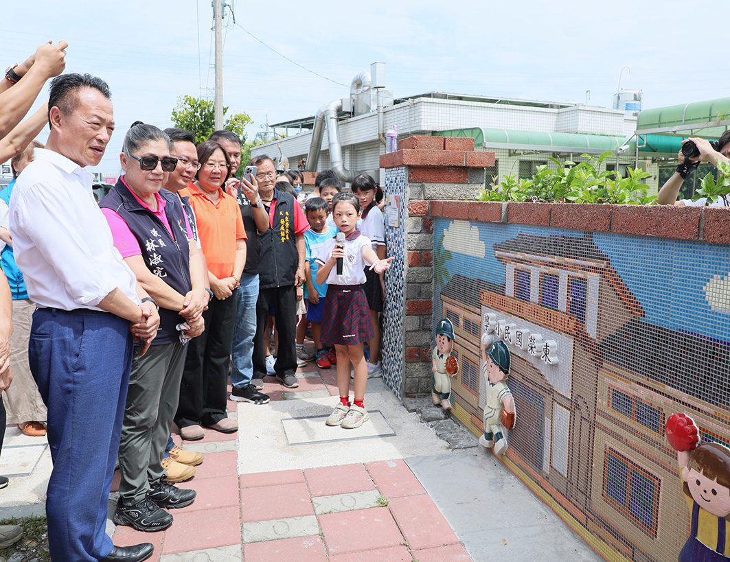 嘉義縣文化基金會與民雄鄉東榮國小及東榮社區發展協會攜手合作,邀請社區長者與學生在學校側門,共同創作25.68公尺長的馬賽克拼貼牆,今(22)日舉行揭幕儀式,不僅為校園增添美麗的風貌,更象徵校園與社區之間的深厚連結,見證了藝術與在地合作的成功典範。