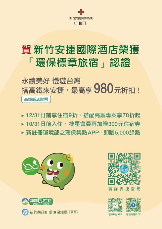 另外,竹縣環保局與新竹安捷國際酒店(AJ HOTEL)合作,鼓勵民眾「搭高鐵、住綠旅」。即日起至10月31日,凡搭乘高鐵入住酒店並註冊環保集點APP,即享週日房價9折優惠,另加贈住宿抵用券與綠點。高鐵票同享78折起優惠,實踐「交通+住宿」一次到位的低碳旅遊,讓永續生活兼顧省錢與便利。
