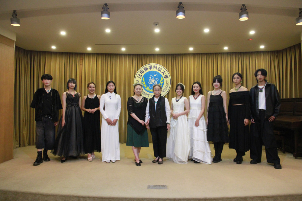 ▲元培醫事科大董事長蔡雅賢(右6)穿戴莊蓮子老師作品、張雅婷藝術家(左5)與走秀的學生合影。(圖/元培醫事科大提供)