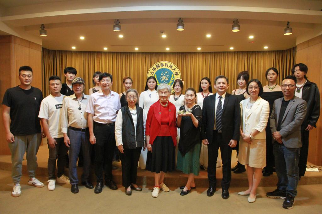 ▲元培醫事科大董事長蔡雅賢(前排左5)、元培校長王綮慷(前排右3)、副校長黃曉令(前排右2)與此次展覽藝術家們及走秀學生合影。(圖/元培醫事科大提供)