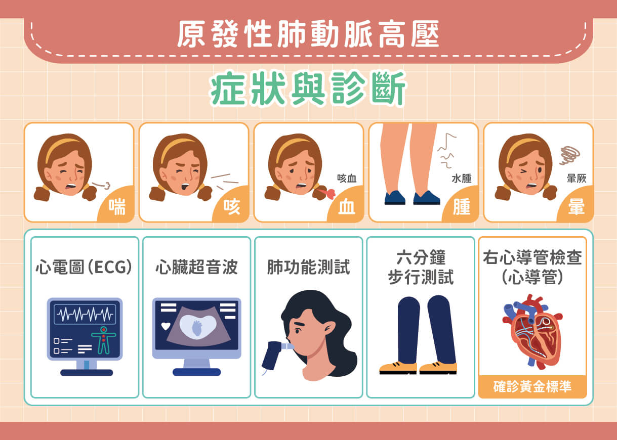 若出現上述「喘、咳、血、腫、暈」的症狀,應盡快就醫。臨床上會透過心電圖、心臟超音波、六分鐘步行測試作初步篩檢,最終則需靠右心導管檢查確診。