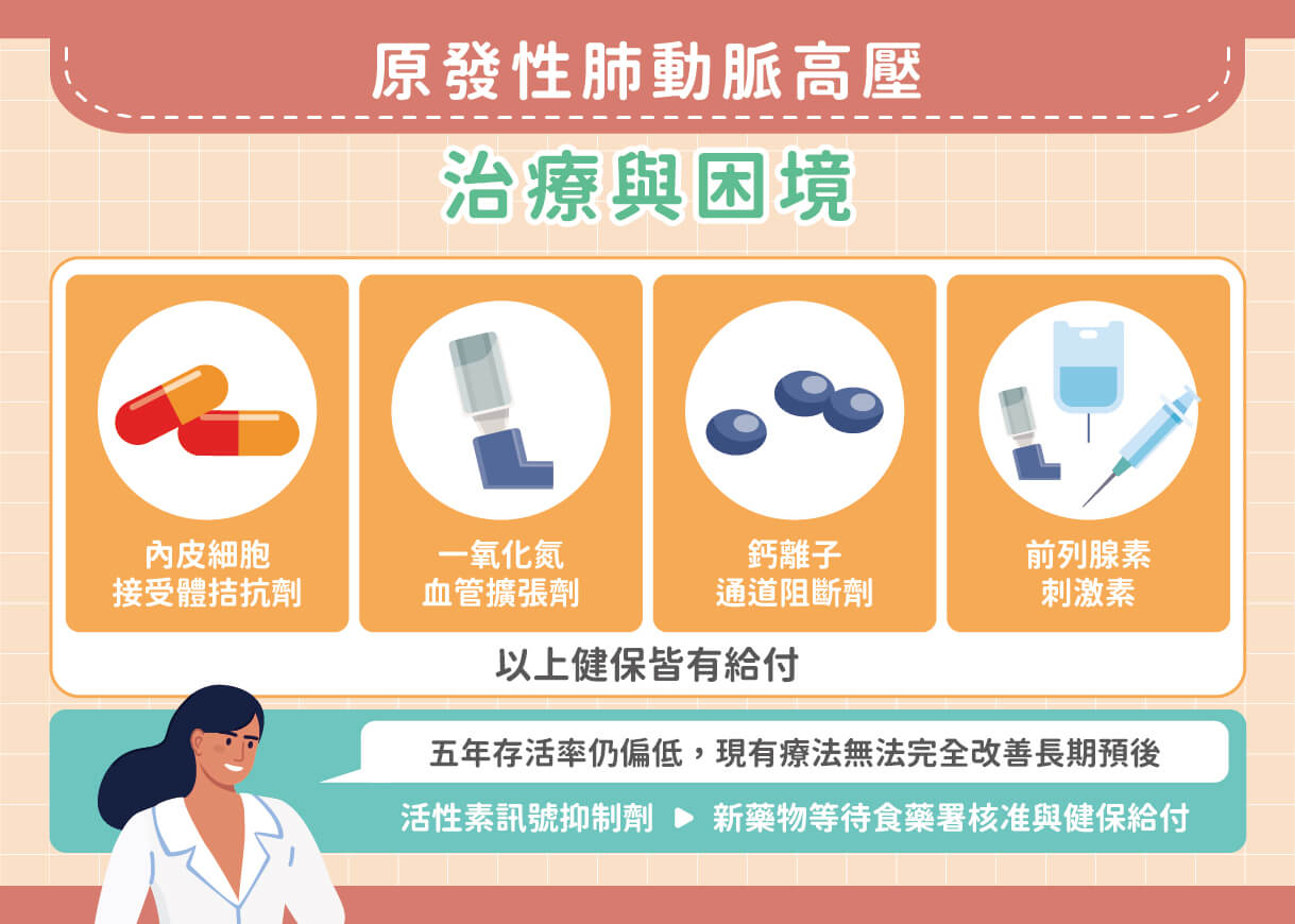 好消息是,近年已有針對肺動脈高壓機轉的標靶藥物問世,稱為「活性素訊號抑制劑」。它不僅讓血管舒張,更能改善阻塞,等於從根本機轉介入治療。國外研究顯示,此類藥物能降低住院率、肺臟移植需求與死亡率。目前台灣已核准上市,但尚未納入健保,期盼能盡早給付,造福更多病友。