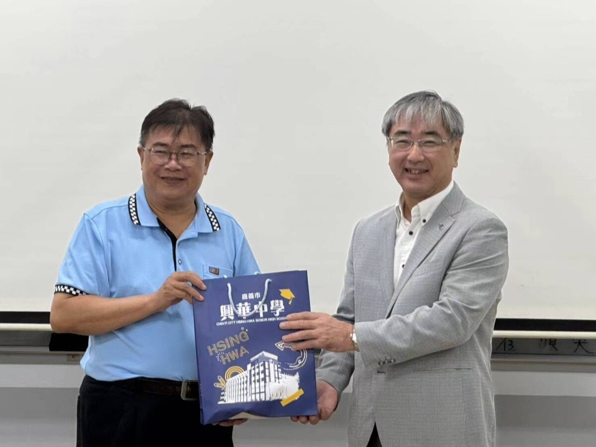 ▲興華中學校長張家碩致贈紀念品予日本博多學園 校長 檜垣泰史。承接這股教育動能,9月18日本校更迎來日本國立九州大學(世界排名167之頂尖校)教授翁文靜蒞校,向學生與家長們分享日本大學升學申請管道與最新資訊,現場提問踴躍,氣氛熱烈。