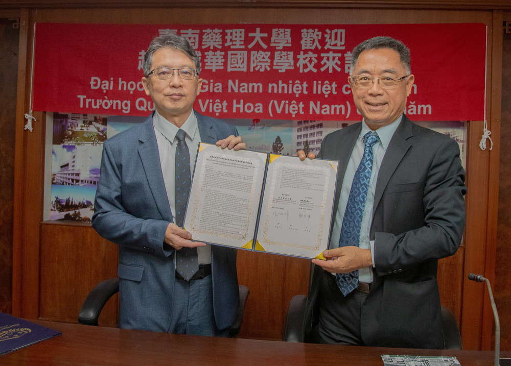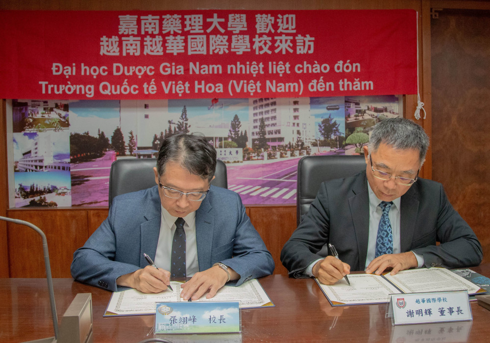 【大成報記者杜忠聰/臺南報導】因應臺灣少子化與高齡化社會對醫療與照護人力需求,嘉南藥理大學與越南平陽省的越華國際學校(Viet Hoa International School, VHIS)簽署合作備忘錄(MOU)。雙方將透過課程合作、教師進修與資源共享等多元模式,並推動「大學預修學分班」,共同打造臺灣與越南之間的教育橋梁,培育能具備國際視野與專業技能的醫療與照護領域優秀人才。