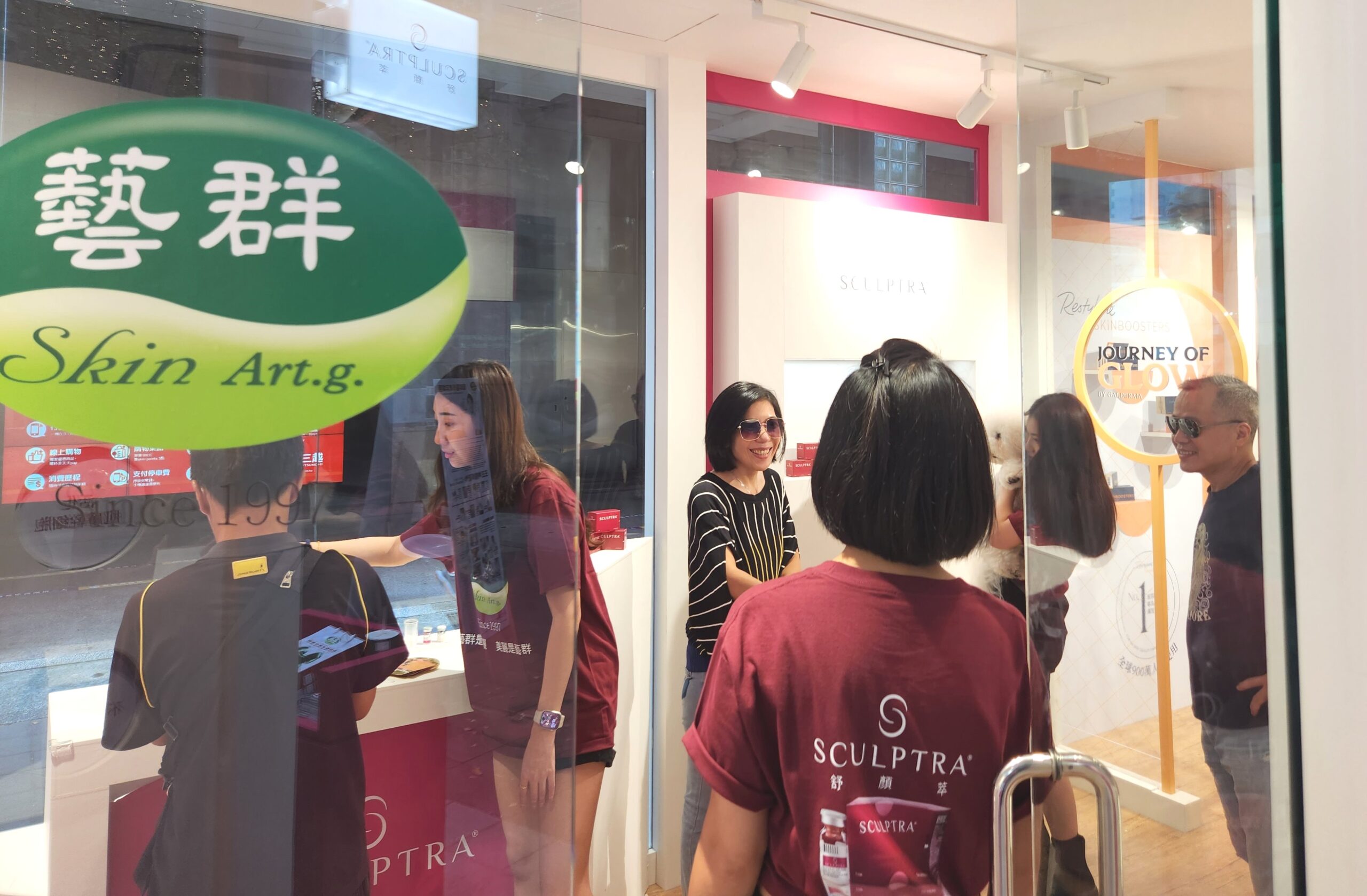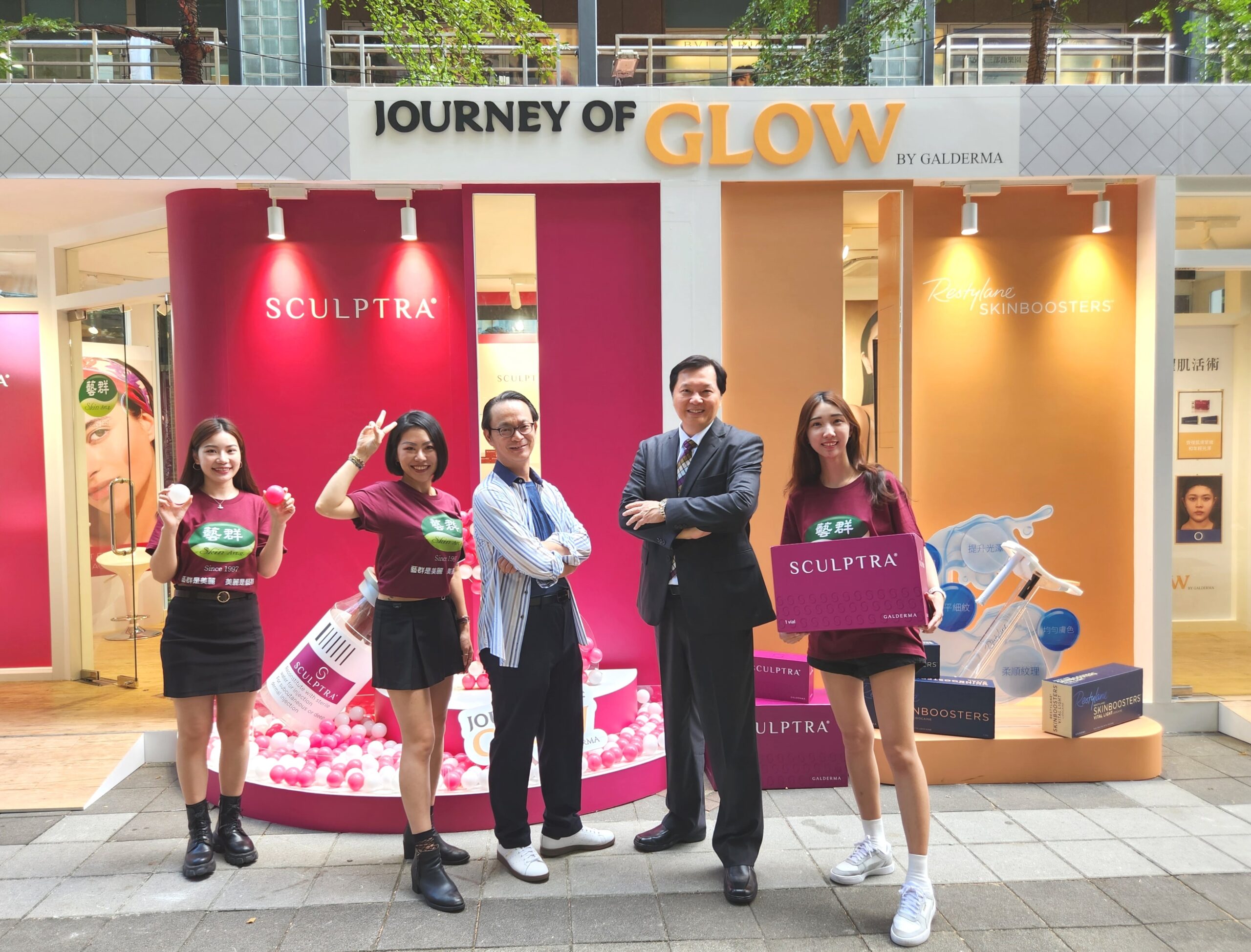 在台北101商圈的香堤大道上,藝群醫美集團以專業元素打造展區,搭配國際醫美品牌Sculptra(舒顏萃)的主視覺,營造出兼具時尚與醫學感的氛圍,街景周圍綠蔭夾道,時尚小屋設於精品商圈中央,展區外牆以「Journey of Glow」為主題,象徵皮膚光輝之旅,從醫學美容出發,邁向健康、自然之美的旅程。