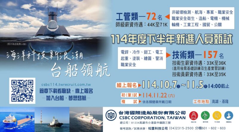 本次招考共釋出工管類72名、技術類157名職缺,涵蓋設計研發至現場製造的關鍵崗位。台船公司誠摯邀請有志於投身國防、綠能及智慧海洋科技的優秀人才踴躍報名,詳細招考職類、資格條件及薪資待遇等資訊請參閱甄試簡章及台船公司官網。