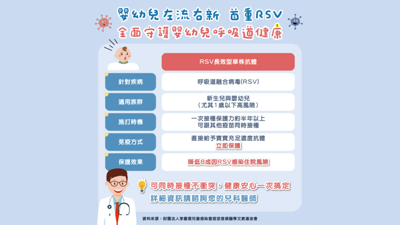 李慶雲兒童感染暨疫苗發展醫學文教基金會董事長暨台大醫院小兒感染科黃立民教授提醒:「除了流感與新冠,呼吸道融合病毒(RSV)對嬰幼兒的威脅更不容忽視。研究顯示,一歲以下嬰兒感染RSV,重症與死亡風險分別比流感高16倍與5倍,未來罹患氣喘的風險也增加3倍。」同時呼籲家長在響應「左流右新」同時,更要「首重RSV」,為寶寶接種RSV長效型單株抗體,直接提供半年以上保護力,安心度過高風險季節。