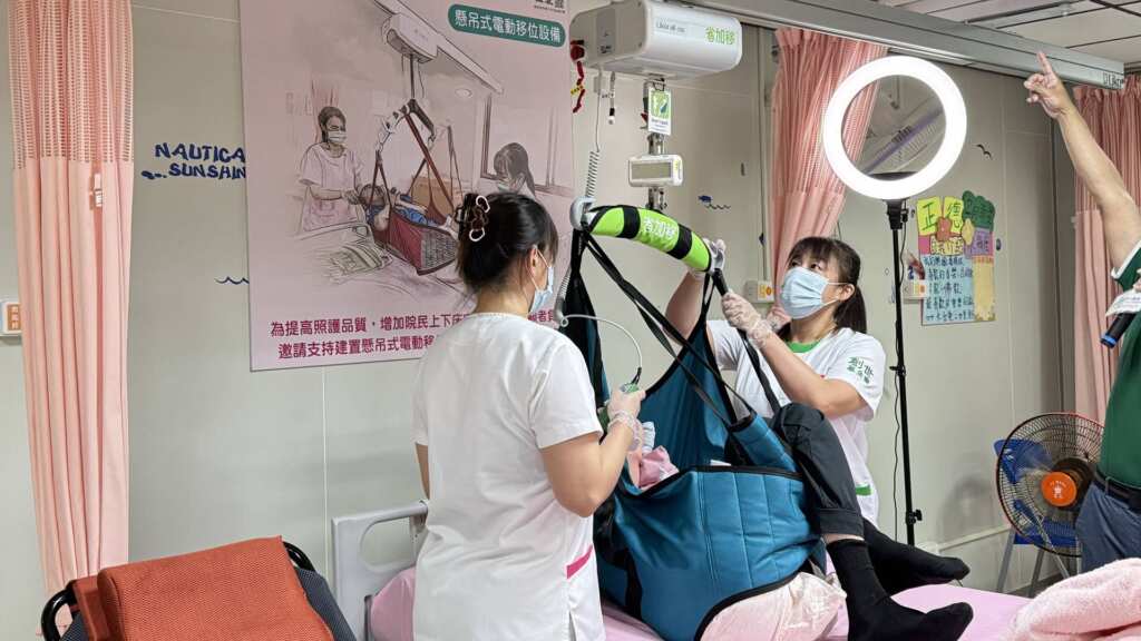▲護理師示範懸吊式電動移位設備。(創世台中院提供)國際獅子會300C-1區總監林玉彪表示,每位植物人背後,都有一段沉重的家庭故事;照顧植物人更是一項需要極大愛心與耐心的長期服務,所以號召獅友們共同支持創世導入智慧輔具及照護設備。不僅提升院民的移位安全及生活品質,也讓辛苦的照護者有更友善的工作環境,這項愛心活動充分發揮獅子會「博愛互助」的精神。
