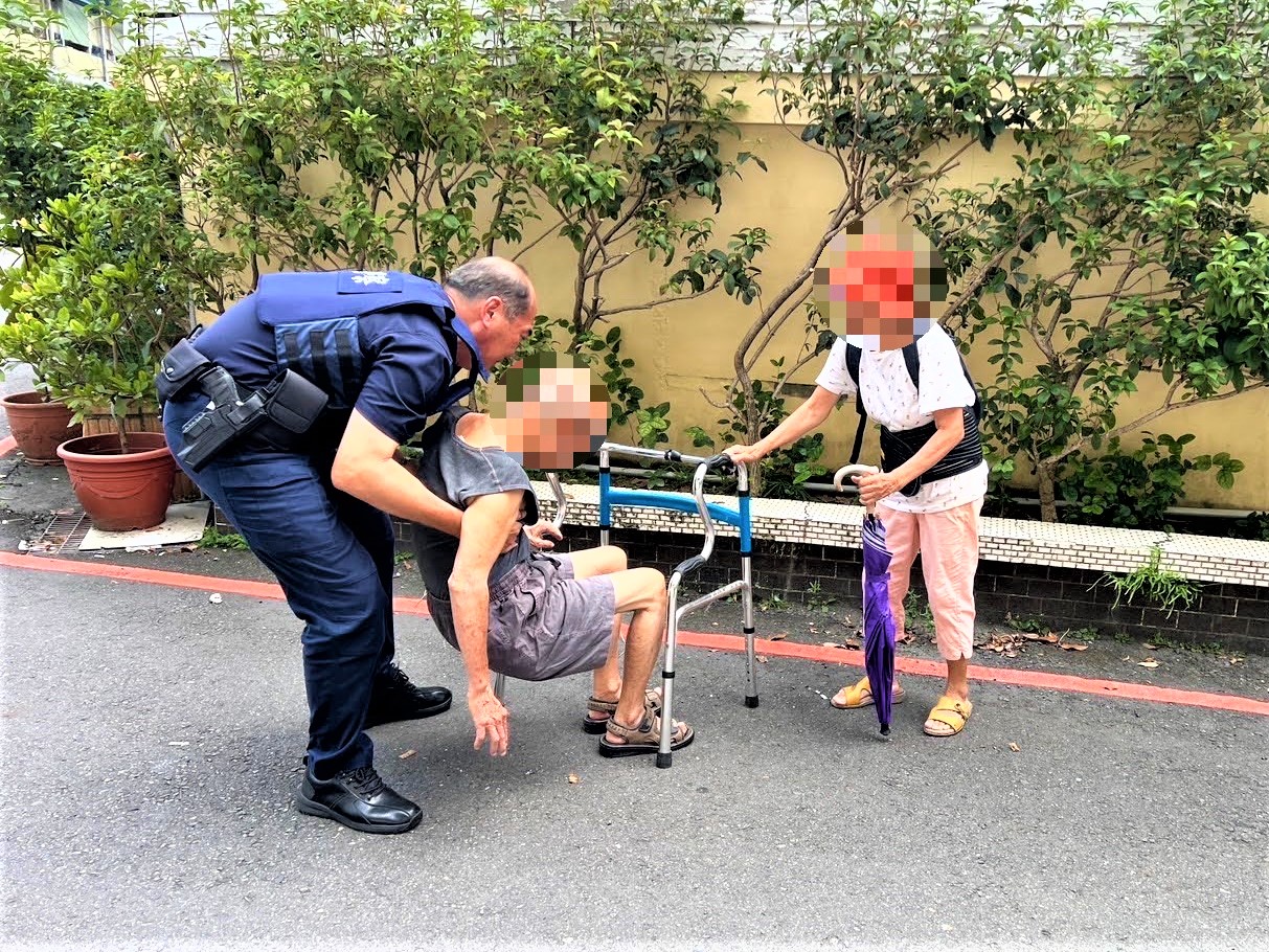 員警即刻停車救援並關懷詢問身旁80歲陳姓妻子,其妻表示,一早夫妻倆外出散步,行經該處時她85歲林姓丈夫突然身體不適跌倒,雖然立即上前攙扶,也因自己年事已高年邁體弱無力攙扶,加上丈夫身體沉重,根本無法獨力扶起。所幸遇上員警正好行經該路口看見林翁倒地,員警也立刻停車趨前查看即刻伸援。