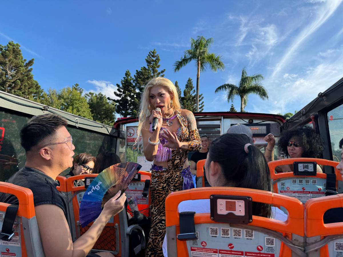「彩虹觀光巴士」遊程中可與變裝皇后導覽員互動交流。(圖/臺北市政府觀光傳播局)