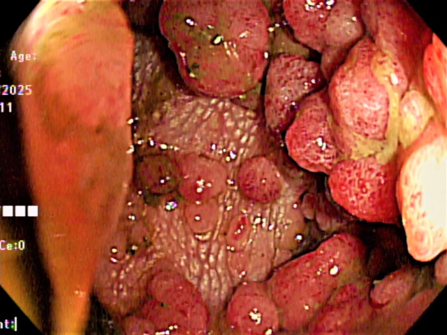 另一名40歲的男性小林,在外院行大腸鏡檢查時發現其大腸內出現數百顆大小不一的瘜肉,在等待檢查報告的期間,因腸阻塞被送到嘉基急診,經基因檢測確認罹患了FAP,同時降結腸瘜肉已有癌化跡象並造成腸阻塞;後續進一步檢查又發現小林同時還罹患十二指腸壺腹癌及肝癌,經歷三次手術及多專科團隊的努力,終於將所有的病灶都完整的切除乾淨。