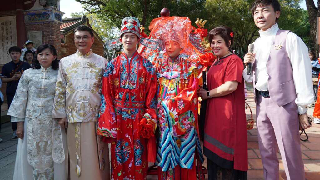 ▲一日丈人的鹿港鎮長許志宏在文武廟以「古式婚禮」送別出嫁的閨女上花轎。(記者林明佑翻攝)鹿港鎮長許志宏表示,「鹿港四季紅~秋收系列活動」,是公所年度重點節慶活動,融合在地文化、糕餅產業、民俗傳統與親子休閒等多元元素,讓民眾在涼爽秋日中享受一場寓教於樂的文化盛會。10月25日、26日兩天安排有「古式婚禮迎親」、「糕餅文化節」、「星空野餐電影院」、「糕聲爭霸賽」、「搞怪變裝比賽」及適合親子共遊的「逗陣放風箏」等活動,內容豐富多元、適合全家大小一同參加。