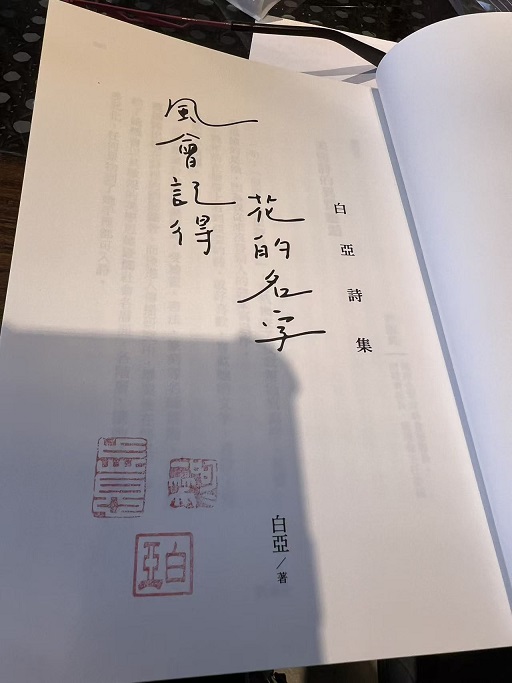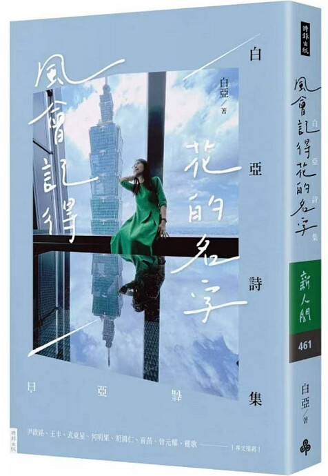 「風會記得花的名字」詩集,除了組詩、系列詩、旅遊詩、主題詩、長詩、短詩之外,同時收錄了其最悲傷時自救的讀秒系列以及及百首補捉靈感的裸詩,小提琴系列100首,將靈魂透明的裸呈於讀者面前,如此魅且真誠的詩情,未曾在坊間其它詩集見過,只因白亞説:「我的文字就是我膚髮,你若關燈,我就脫去衣裳,紅酒你的眼睛。」