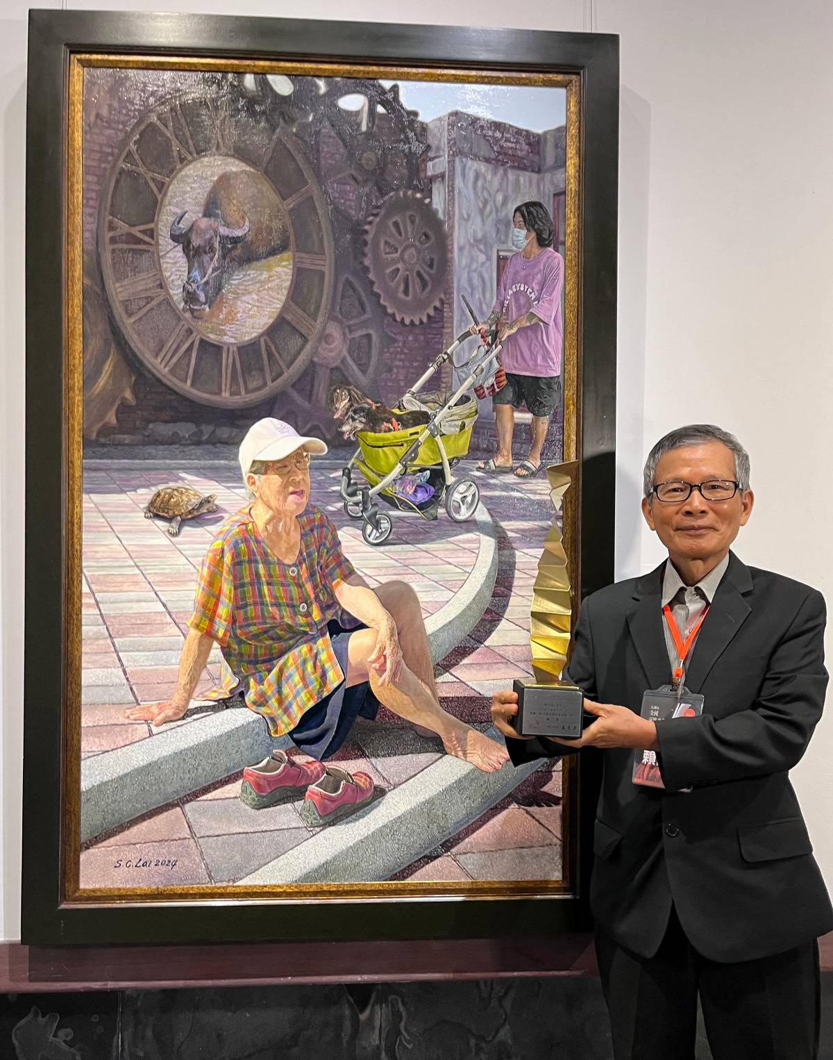 本屆首獎作品-賴世昌《老有所終》以寫實筆觸描繪長者風貌,象徵時間與生命流轉。(圖/台中市政府)