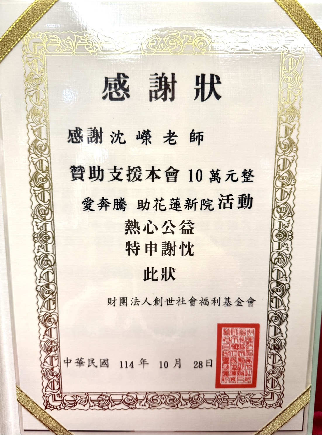 2019年起命理師沈嶸發起「每月捐十萬,持續二十年」公益計畫,至今累積捐款已達730萬元,持續朝總目標「2400萬元(回饋台灣二十年)」邁進。本月沈嶸捐贈10萬元給「財團法人創世社會福利基金會(下稱創世基金會)」贊助「愛奔騰助建院」助建花蓮新院基礎工程經費,為花蓮地區目前1061位植物人及重度失能者家庭提供服務,落實「在地安養」。