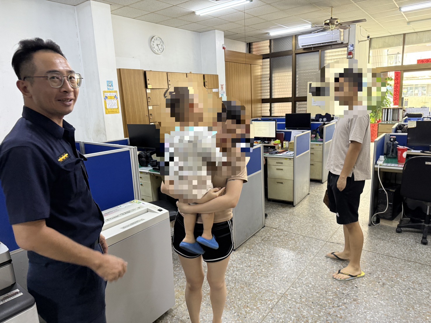 雖然男童始終無法正確描述家中地址,父母親聯絡電話均茫然不知,員警研判有可能居住在附近,便耐心詢問附近民眾有無認識男童家屬,經當地鄰居住戶熱心指引描述住處就在不遠位置後,先載返所並提供餅乾飲料食用,積極聯繫里鄰長的協助確認,終於順利找到男童家人。父母親接獲通知也心急如焚趕赴派出所,看到兒子平安終於鬆一口氣,當男童見父母親前來時,便歡喜高興地擁抱,場面溫馨,父親非常感謝員警積極熱心為民服務,順利與兒子相聚團圓,頻頻對警方積極關懷協助深表感激。